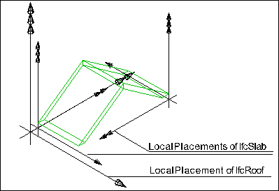 Geometric representation by aggregated elements If the IfcRoof has components (referenced by SELF\IfcObject.IsDecomposedBy) then no independent geometric representation shall defined for the IfcRoof. The IfcRoof is then geometrically represented by the geometric representation of its components. The components are accessed via SELF\IfcObject.IsDecomposedBy[1].RelatedObjects. The geometric representations that are supported for the aggregated elements are defined with each element. See geometric use definition for IfcSlab, IfcBeam, IfcColumn, IfcBuildingElementPart and other subtypes of IfcBuildingElement. Figure 6.1.3.31.D illustrates roof placement, with an IfcRoof defining the local placement for all aggregated elements. ![]() This concept can be applied to the following resources:
